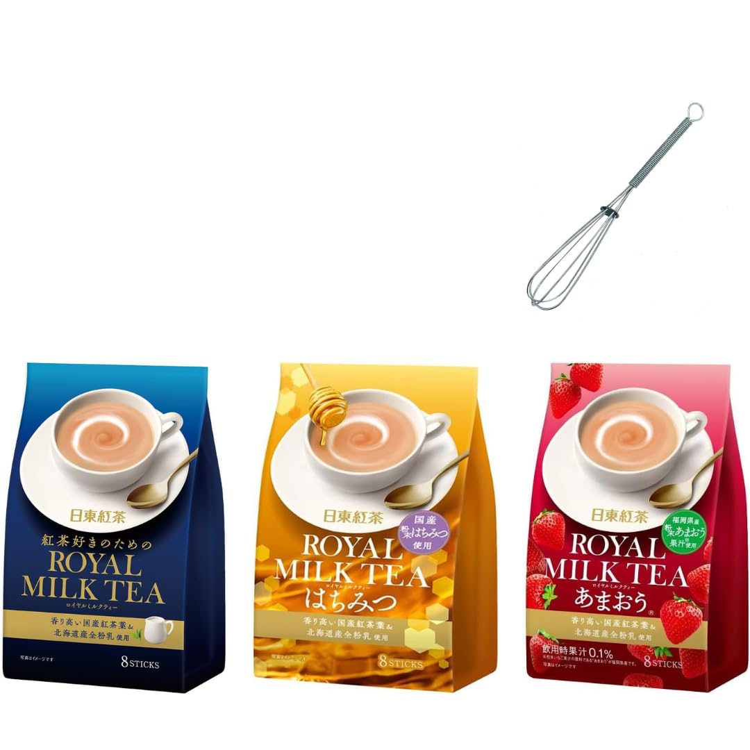 Nitto Royal Milk Tea Powder Japanese 3 Flavors Assortment Pack Milk/Honey/Strawberry 24 Servings (8 Sticks x 3 Packs) And Stirring Rod
