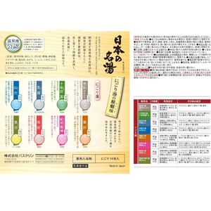Noboribetsu Carulus: dried sodium sulfate, sodium bicarbonate, sodium K chloride, precipitated Ca2CO3 dextrin, Ti oxide, silicic anhydride, fragrance ■Towada Ivy: dried sodium sulfate, sodium bicarbonate, K chloride, precipitated Ca2CO3 dextrin, Ti oxide, L Other Ingredients: Dextrin, Ti oxide, trimethylammoniohydroxypropyl hydroxyethylcellulose chloride, silicic anhydride, fragrance, green 204, blue 2 ■Nippou: Mg sulfate, sodium bicarbonate, dried sodium sulfate, K chloride, precipitated Ca carbonate dextrin, Ti oxide, trimethylammoniohydroxypropyl hydroxyethylcellulose chloride, silicic anhydride Other Ingredients: Dextrin, Ti oxide, sodium L-glutamate, anhydrous silica, fragrance, blue 1 ■Nagigawa: sodium bicarbonate, sodium sulfate, Ca carbonate, sodium chloride, Mg sulfate sodium L-glutamate, dextrin, Ti oxide, sodium L-glutamate, anhydrous silica, fragrance, blue 1 Other Ingredients: Sodium L-glutamate, dextrin, Ti oxide, anhydrous silica, fragrance, yellow 5, red 102 ■Kishu Ryujin: Sodium hydrogen carbonate, dried sodium sulfate, precipitated Ca carbonate, K chloride, dextrin, Ti oxide, sodium L-glutamate, jojoba oil, concentrated glycerin, trimethylammonium hydroxychloride, and Mg sulfate Methylammoniohydroxypropyl hydroxyethylcellulose, silicic anhydride, fragrance, red 2, red 230 (1) ■Beppu: sodium hydrogen carbonate, dried sodium sulfate, K chloride, precipitated Ca carbonate, sodium chloride sodium L-glutamate, silicic anhydride, dextrin, fragrance, Ti oxide, Blue 2, Red 227, Yellow 5, Viscosity adjuster ■Kurokawa: sodium sulfate, sodium bicarbonate, K chloride, precipitated Ca carbonate sodium L-glutamate, kaolin, dextrin, Ti oxide, tri(caprylic/capric acid) glyceryl, silica anhydrous, glycerin concentrate, Fragrance, Yellow 202(1), Yellow 4