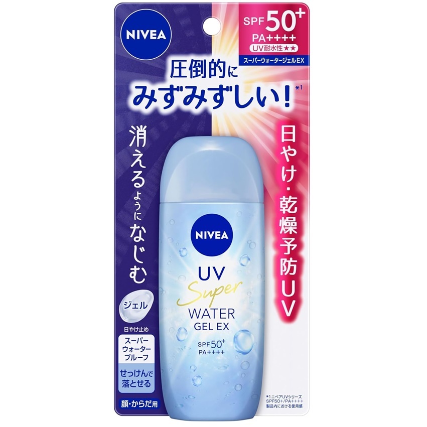 ◆Sunscreen UV SPF50+/PA++++/UV water resistance★ ◆Unparalleled freshness and comfort*1. The gel spreads over the entire body and blends quickly so that it disappears. Super waterproof, removable with soap *1 NIVEA UV series SPF50+/PA++++